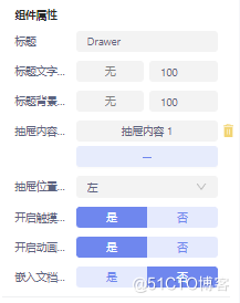 抽屉:实现抽屉效果,在抽屉容器中放置需要展示的内容即可,组件属性配置如图所示: