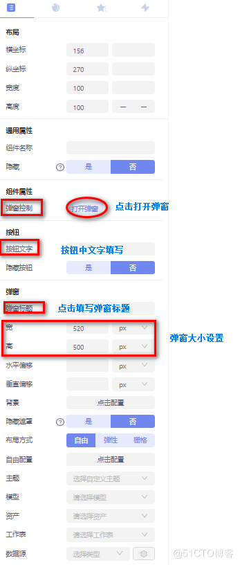 弹窗容器:弹窗容器可点击按钮显示弹窗的效果,基本属性配置如图: