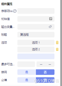 复选框 :选项为多选设置,画面预览时可对复选框进行操作,组件基本属性配置如图所示: