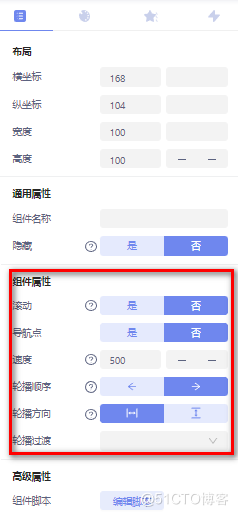 轮播容器:用以实现画面、网页、图片等内容的轮播效果,将需要轮播的内容定义在轮播容器中即可,基础属性配置如图: