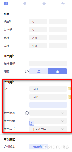 标签切换容器:标签切换容器可呈现TAB页切换的效果,标签个数可按需定义,分别定义每个标签页内需要显示的内容,基本属性配置如图