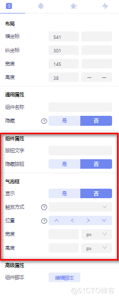 按钮:画面预览时,页面上用来点击的按钮组件,组件属性配置如图所示: