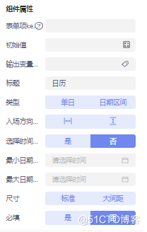 时间选择器:画面预览时,页面上选择日期的组件,组件属性配置如图所示: