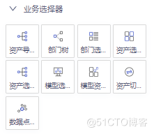 业务选择器包括资产导航树、部门树、部门选择器、资产选择器、资产选择树、模型选择器、模型资产选择器、资产切换按钮和数据点选择器。