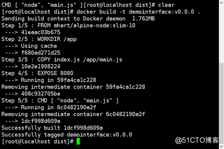 编译镜像:输入编译命令“docker build -t demointerface:v0.0.0 .”编译文件,其中“demointerface:v0.0.0”为接口服务名和版本,其后的‘.’表示编译至当前目录,编译镜像结果如图 9-19 所示。