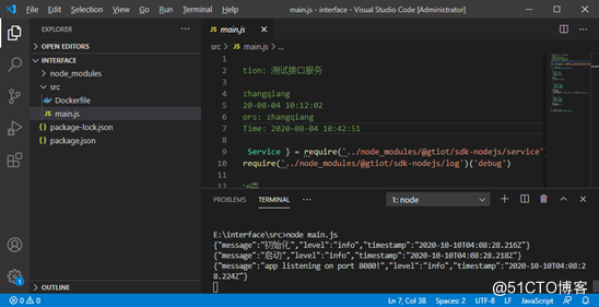 在 interface 目录下创建 src 目录,并将 example/service 目录下 main.js 文件和 Dockerfile 文件复制至 src 目录下,打开 main.js,修改导包目录,修改后程序如下所示。首先导入程序包,然后新建类 TestService,并继承 Service 类,包含 init、start、stop 等函数,任务的启动、停止通过此类完成的,最后实例化并开始运行任务。