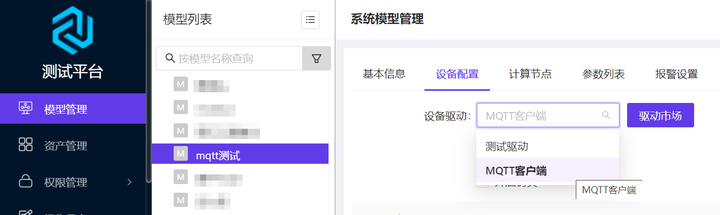 1.在系统模型管理界面中选择要配置的模型,右侧选项卡选择设备配置,在设备驱动一栏选择MQTT客户端。无无该选项时,点击右侧的驱动市场按钮在线安装驱动。