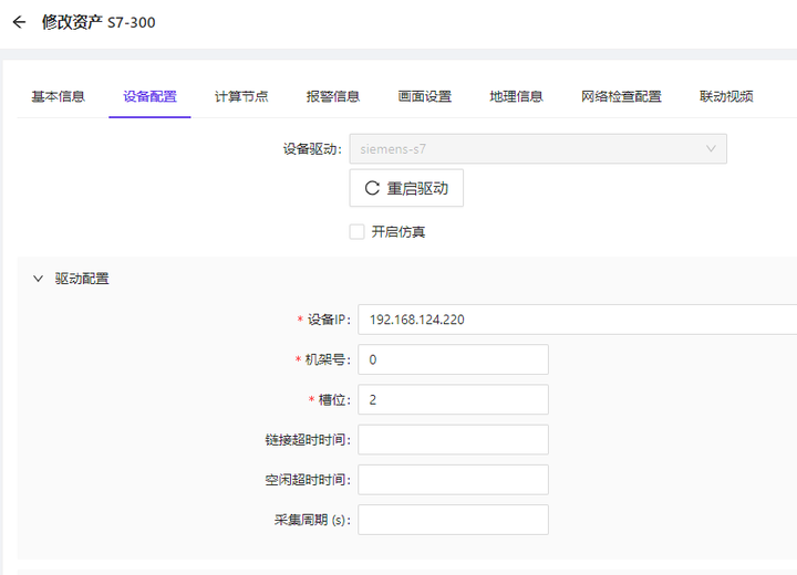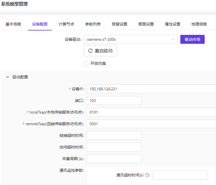 1、打开模型管理,切换到设备配置,选择西门子siemens-s7驱动程序。