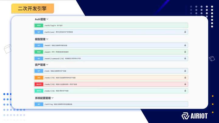 AIRIOT平台提供丰富的前端、后台服务二次开发接口,具备灵活的组件服务部署与管理能力,对任何功能模块进行二次开发,满足客户各类二次开发需求。支持多种常用开发语言SDK,提供RESTful API。具有强大的脚本编辑能力,能满足各种报警、事件、画面功能扩展需求,服务管理、镜像管理同样一应俱全。