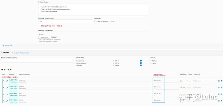 将你所有需要加入虚拟局域网的设备都安装客户端并加入虚拟网络之后, 再次回到网络管理的页面, 允许你的设备加入网络, 并且你可以在右侧配置静态IP.
