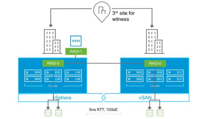 虽然现在双活方案的门槛下降了很多,但是,对于大部分的企业来说,实施方面还是有颇多的限制。以VMware的vSAN为例,它要求两个站点的时延在5ms范围内,一般不能超过100公里,而且,需要万兆的网络条件。如果这些你都可以满足,还需要有一个第三站点做仲裁。而且,站点两边的存储必须是同构的。