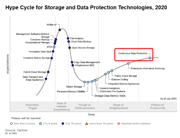 在最新的Gartner报告《Hype Cycle for Storage and Data Protection Technologies, 2020》中,Gartner把CDP定位为高优先级的数据保护技术,将会在未来的2-5年达到部署的高峰。从曲线来看,可能明年就离开这个技术成熟度曲线了,因为CDP技术已经足够成熟,就像固态阵列一样。