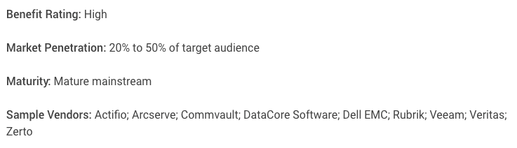 Gartner在CDP技术里面,列出了几个典型的CDP厂商,其中,专注于虚拟机的真CDP厂商只有Zerto。因此,我们就以Zerto为代表来介绍虚拟机的真CDP保护方案。