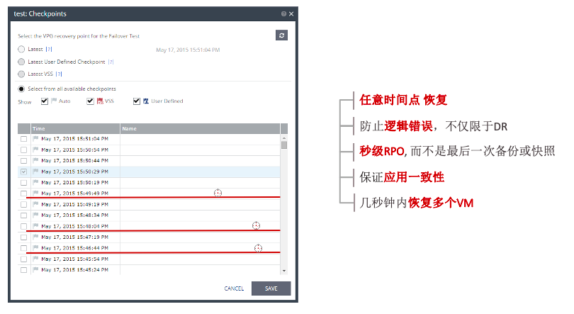 当然,既然是真CDP方案,Zerto可以做得秒级的RPO,可以恢复到30天内任意时间点,有效防止逻辑错误和勒索病毒的危害。