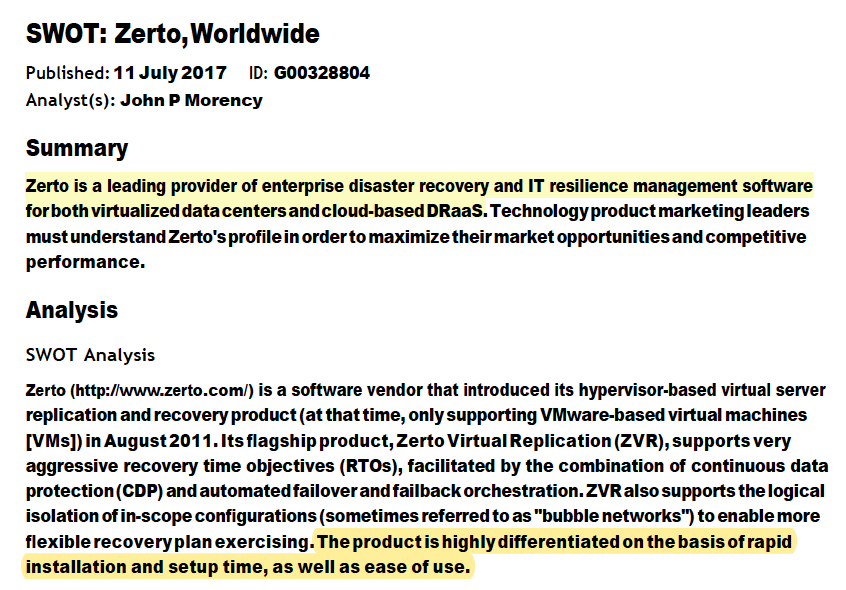 市场上容灾产品很多,但是大部分安装部署都比较复杂,使用起来学习成本也很高。Zerto这块尤其做得好,Gartner的分析师在《SWOT: Zerto, Worldwide》报告中称赞Zerto说“该产品以快速安装和设置时间以及使用方便为基础,具有很强的差异化。”