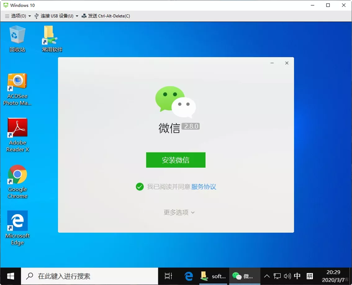 注销虚拟桌面计算机,再次登录桌面上就自动创建了“常用软件”的快捷方式,双击该快捷方式打开,可以看到个人微信和企业微信的安装程序。然后用鼠标双击就可以以管理员的权限安装软件,如图所示。