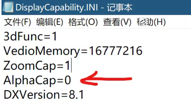 因为不支持 3D 功能,需要修改游戏中的显示配置文件 DisplayCapability.INI 中的内容,直接双击使用记事本打开即可,修改为 AlphaCap=0