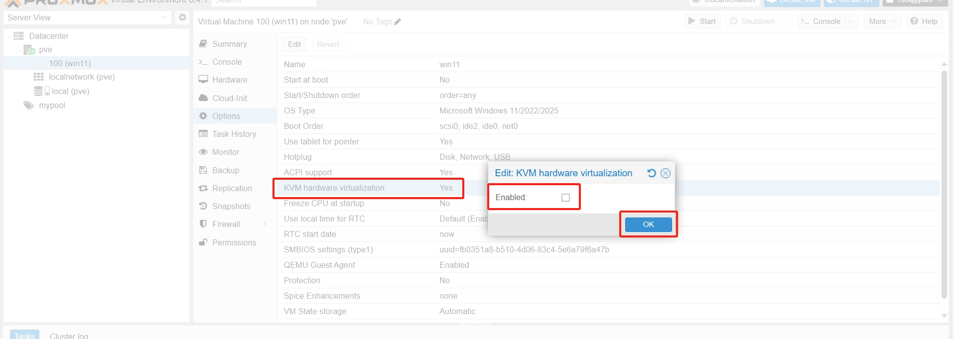 如果本身不支持嵌套虚拟化,那么只能用qemu64类型的CPU,且需要在启动虚拟机前修改Options[选项]中的KVM hardware virtualization[KVM硬件虚拟化]
