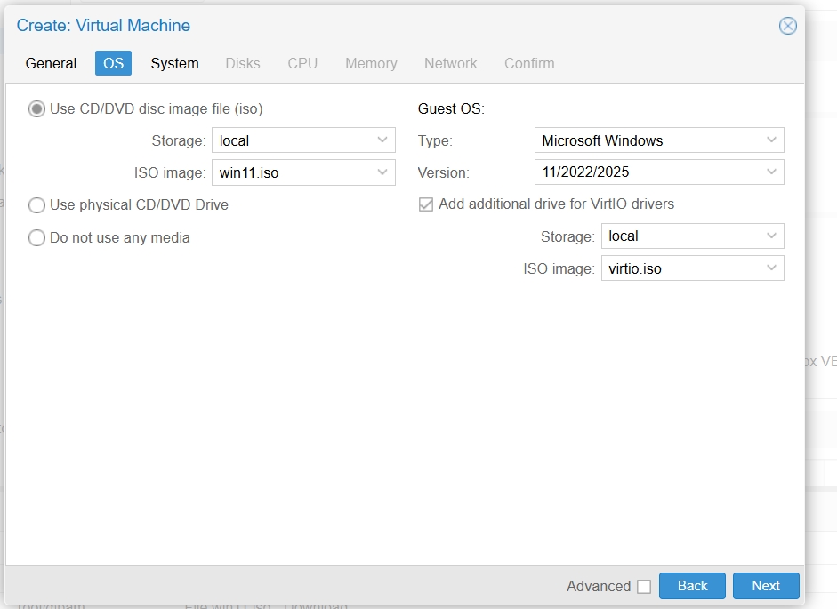 而在更低版本的ProxmoxVE中,比如7.x和6.x的版本,OS这一栏默认无法选择virtio启动加载