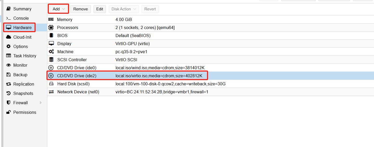这就需要手动在Hardware[硬件]中点击Add[添加]添加CD/DVD Drive选择下载好的virtio的ISO文件