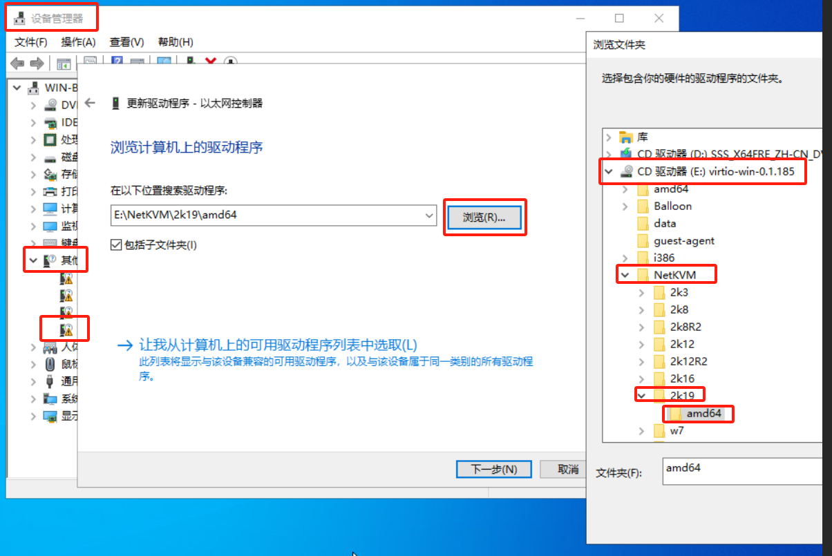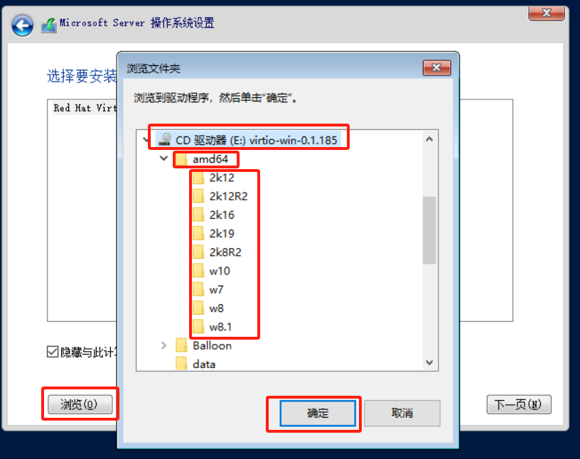 然后选择驱动盘是virtio的,点击打开,从amd64那导入对应系统名字的驱动即可