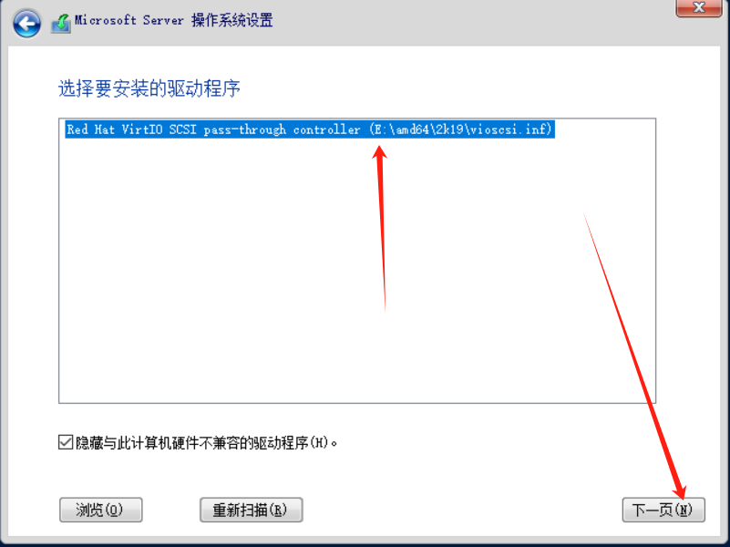 我的是windows server 2019的镜像所以导入的是2k19的驱动,导入完毕后选择导入的驱动,点击下一页