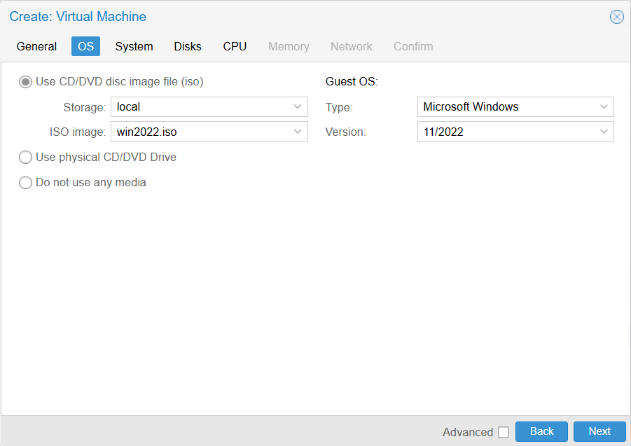在OS窗口中,ISO image勾选win.iso,Guest OS勾选Type为Microsoft Windows类型,Version选择当前ISO的win的版本,示例下载是2022,就选11/2022类型,然后点击Next。