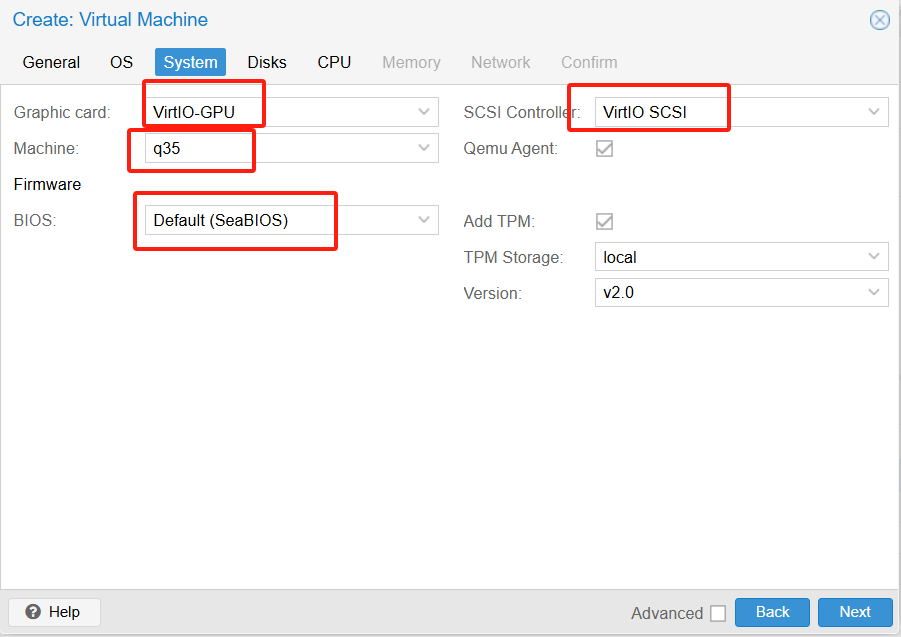 System窗口中,Graphic card勾选VirtIO-GPU类型,Machine勾选q35类型,SCSI Controller勾选VirtIO SCSI类型,BIOS勾选Default (SeaBIOS)类型,然后点击Next。