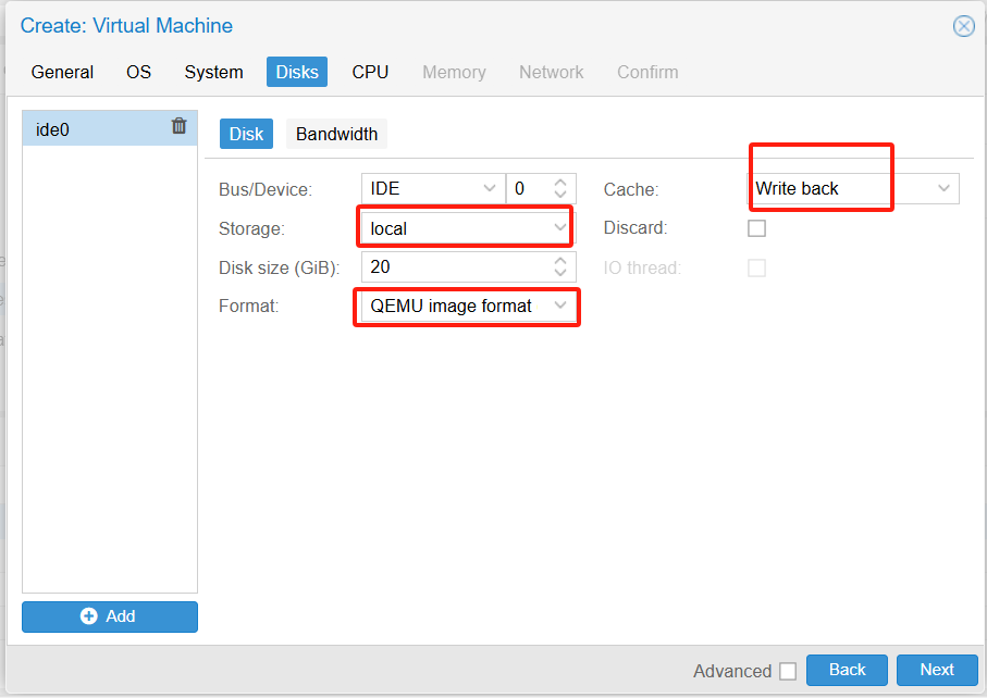 Disk窗口中,Cache勾选Write Back类型,Disk size (GiB)填写你要分配的硬盘大小,一般不小于20,Storage选择存储在哪个盘,示例只有系统盘local所以就选loacl,然后点击Next。
