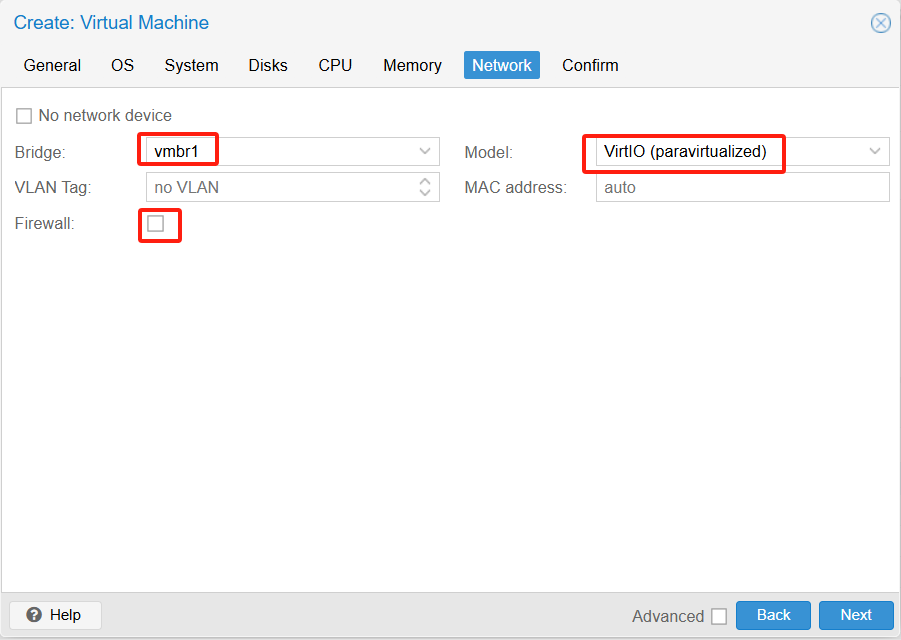 Network窗口中,Bridge勾选vmbr1类型,Model勾选VirtIO (paravirtualized)类型,Firewall取消勾选,然后点击Next。