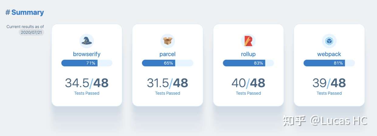 测评通过的 test 得分只是一个方面,实际情况也和不同构建工具的设计目标有关。比如,Webpack 的构建主要依赖了插件和 loader,因此它的能力虽然强大,但配置信息较为烦琐。而 Parcel 的设计目标之一就是零配置,开箱即用,但是在功能的集成上相对有限。