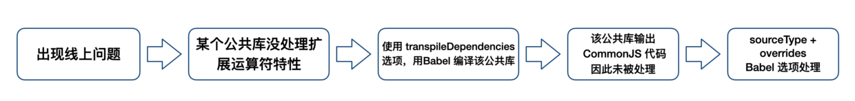 现在问题找到了,或许直接将出现问题的公共库代码用 Babel 进行编译降级就可以了。在文中环境下,需要在 vue.config.js 中加入对问题公共库 module-name/library-name 的 Babel 编译流程: