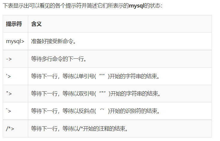 (5)要注意提示符如何从mysql>变为->,这正是mysql如何指出它没见到完整的语句并且正在等待剩余的部分。提示符是你的朋友,因为它提供有价值的反馈,如果使用该反馈,将总是知道mysql正在等待什么。如果你决定不想执行正在输入过程中的一个命令,输入\c取消它: