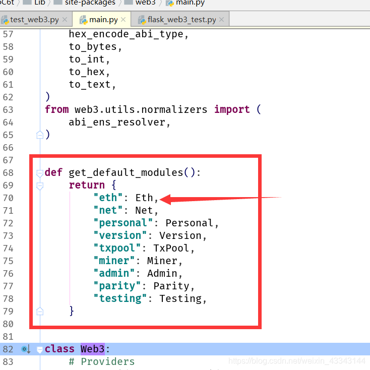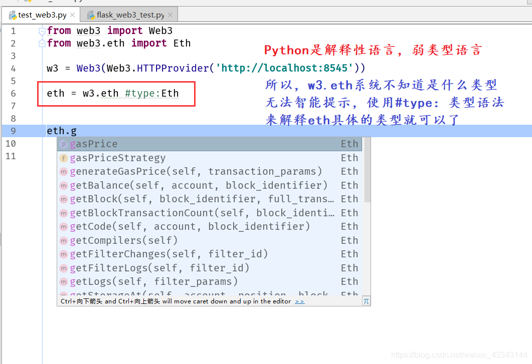 至于为什么w3.eth无法直接提示,可以看web3.py的源代码你会发现Web对象中根本就没有直接的属性“eth”,而是通过字典封装的!所有无法直接提示
