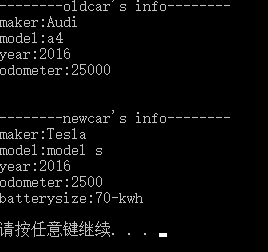 #include <iostream> using namespace std; #include "car.h" #include "electricCar.h" int main() { // 测试Car类 Car oldcar("Audi","a4",2016); cout << "--------oldcar's info--------" << endl; oldcar.updateOdometer(25000); cout << oldcar << endl; // 测试ElectricCar类 ElectricCar newcar("Tesla","model s",2016); newcar.updateOdometer(2500); cout << "\n--------newcar's info--------\n"; cout << newcar << endl; system("pause"); return 0; } main.cpp