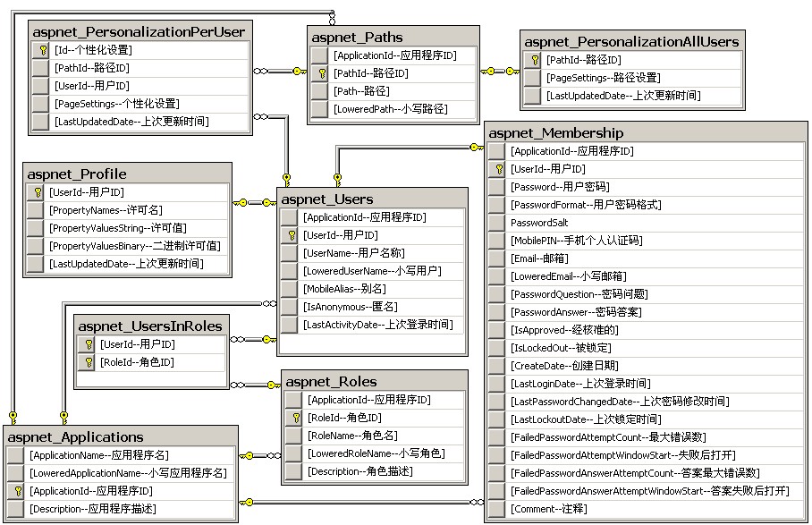 用户数据库就是由这些表组成的,理解了数据库的结构后,再来看待整个asp.net 2.0用户管理功能就会有比较清晰的认识了。另外两个表与用户管理没有直接关系的:aspnet_WebEvent_Events,用于记录系统在运行过程中去现的一些异常信息,需配合Health monitor使用;aspnet_SchemaVersions用于记录当前的框架版本信息,默认已经有记录了。