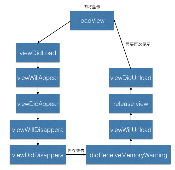 在收到内存警告时,应该从没有显示的视图开始销毁,销毁过程中会先调用viewWillUnload,销毁视图,再调用viewDidUnload方法: