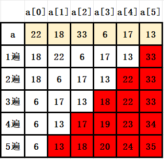 第一遍(轮、趟)从第1个元素开始,让它和第2个元素进行比较,若出现反序(大数在前,小数在后)则交换;然后让第2个元素和第3个元素进行比较,若出现反序则交换;依次类推,直到比较完最后一对元素为止。第一遍排序结束时,最后一个元素为所有元素中的最大值。
