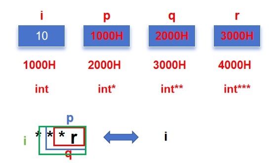 1 # include <stdio.h> 2 int main(void) 3 { 4 int i = 10; 5 int * p = &i; 6 int ** q = &p; 7 int *** r = &q; 8 // r = &p;//错误,因为r是int ***类型,r只能存放int ** 类型的地址 9 printf("i = %d\n", ***r); 10 return 0; 11 }