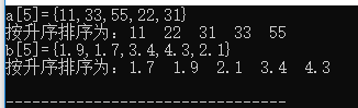 #include <iostream> using namespace std; template<class T> void Quicksort(T a[],int m,int n) { int i=m, j=n-1; T t=a[i]; if(i<j) {while(i<j) { while(i<j&&a[j]>=t) j--; if(i<j) {a[i]=a[j];i++;} while(i<j&&t>a[i]) i++; if(i<j){a[j]=a[i];j--;} } a[i]=t; Quicksort(a,m,i); Quicksort(a,i+1,n); } } int main() { int i; int a[5]={11,33,55,22,31}; cout<<"a[5]={11,33,55,22,31}"<<endl; Quicksort(a,0,5); cout<<"按升序排序为:"; for(i=0;i<5;i++) cout<<a[i]<<" "; cout<<endl; double b[5]={1.9,1.7,3.4,4.3,2.1}; cout<<"b[5]={1.9,1.7,3.4,4.3,2.1}"<<endl; Quicksort(b,0,5); cout<<"按升序排序为:"; for(i=0;i<5;i++) cout<<b[i]<<" "; cout<<endl; return 0; }