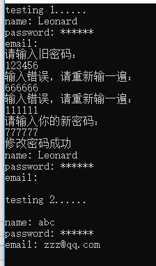 #include<iostream> #include<string> using namespace std; class User{ public: void setInfo(string name0,string passwd0="111111",string email0=" "); void changePasswd(); void printInfo(); private: string name; string passwd; string email; }; void User::setInfo(string name0,string passwd0,string email0) { name=name0; passwd=passwd0; email=email0; } void User::changePasswd() { string passwd; int i=0; cout<<"请输入旧密码:"<<endl; cin>>passwd; while(passwd!="111111"&&i<3) {i++; cout<<"输入错误,请重新输一遍:"<<endl; cin>>passwd; } if(passwd=="111111") {cout<<"请输入你的新密码:"<<endl; cin>>passwd; cout<<"修改密码成功"<<endl; } else if(i==3) cout<<"请稍后再试"<<endl; } void User::printInfo (){ cout<<"name: "<<name<<endl; cout<<"password: "<<"******"<<endl; cout<<"email: "<<email<<endl; } int main() { cout<<"testing 1......"<<endl; User user1; user1.setInfo("Leonard"); user1.printInfo(); user1.changePasswd(); user1.printInfo(); cout << endl << "testing 2......" << endl << endl; User user2; user2.setInfo("Jonny","92197","xyz@hotmail.com"); user2.printInfo(); return 0; }