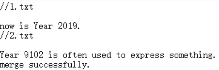 #include <iostream> #include <fstream> #include <cstring> #include <cstdlib> using namespace std; int main() { string filename1, filename2, newfilename; cout << "输入要合并的两个文件名: " ; cin >> filename1 >> filename2; cout << "输入合并后新文件名: " ; cin >> newfilename; ofstream fout; // 输出文件流对象 ifstream fin; // 输入文件流对象 fin.open(filename1); // 将输入文件流对象fin与文件filename1建立关联 if(!fin.is_open()) { // 如果打开文件失败,则输出错误提示信息并退出 cerr << "fail to open file " << filename1 << endl; exit(0); } fout.open(newfilename); // 将输出文件流对象fout与文件newfilename建立关联 if(!fin.is_open()) { // 如果创建/打开文件失败,输出错误提示信息并退出 cerr << "fail to open file " << newfilename << endl; exit(0); } char ch; // 从文件输入流对象fin中获取字符,并将其插入到文件输出流对象fout中 while(fin.get(ch)) fout << ch; fin.close(); // 关闭文件输入流对象fin与文件filename1的关联 fout << endl; // 向文件输出流对象fout中插入换行 fin.open(filename2); // 将输入文件流对象fin与文件filename2建立关联 if(!fin.is_open()) { // 如果打开文件失败,则输出错误提示信息并退出 cerr << "fail to open file " << filename2 << endl; exit(0); } // 从文件输入流对象fin中获取字符,并将其插入到文件输出流对象fout中 while(fin.get(ch)) fout << ch; fin.close(); // 关闭文件输入流对象fin与文件filename2的关联 fout.close(); // 关闭文件输出流对象fout与文件newfilename的关联 ofstream fapp; fapp.open(newfilename,ios_base::app); fapp<<endl; fapp<<"merge successfully."; fapp.close(); system("pause"); return 0; }