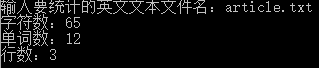 #include<string.h> #include<fstream> #include<iostream> using namespace std; int main() { ifstream in("article.txt"); long ln=0,cn=0,wn=0; char str[1000]; while (in.getline(str, 1000)) { for (int i=0;i<strlen(str);i++) { cn++; if (str[i] == ' '||str[i]=='...'||(str[i]=='.'&&str[i + 1]!= '.'&&str[i - 1] != '.') || str[i] == ',') { wn++; } } ln++; } wn--; cout<< "行数:" << ln<< endl << "字符数:" << cn<< endl <<"单词数:"<<wn<< endl; in.close(); system("pause"); return 0; }