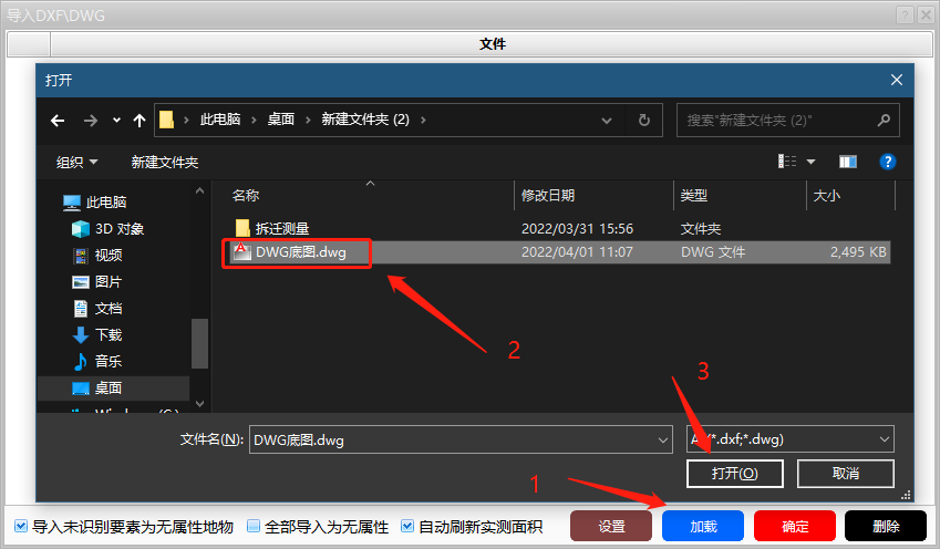 点击【加载】打开文件选择对话框,在弹出的对话框内选择要加载的DWG或DXF图形文件,然后点出【打开】;