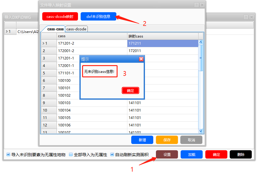 点击【设置】打开映射设置对话框,点击弹出对话框内的【dxf未识别信息】,如果出现如下内容【无未识别cass信息!】表示无需处理,点击【取消】即可,否则应由项目技术负责根据项目要求添加转换映射记录;