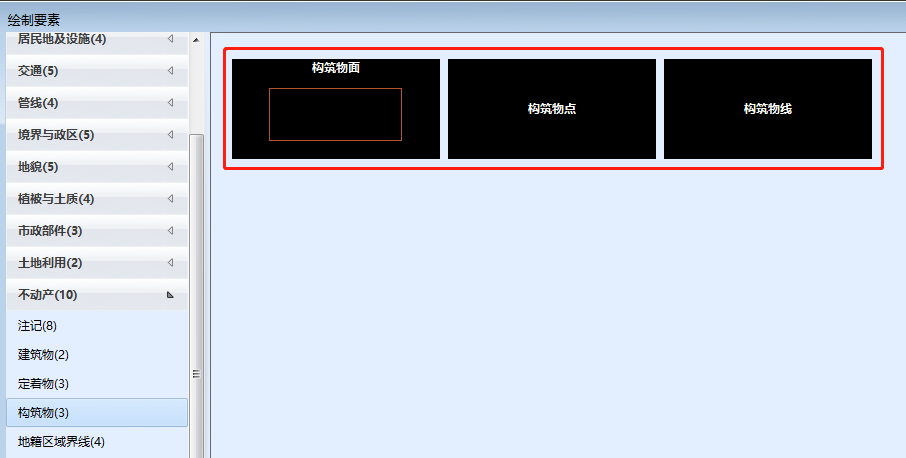 完成后可通过F1快捷键打开要素绘制功能,选择需要的构筑物要素进行绘制,单个构筑物内可绘制多个同类型的(点、线、面)构筑物要素,单个层属构筑物内不能包含多个类型;