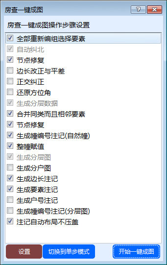 先选择宗地及宗地所属的所有房屋及地面构筑物,然后执行【房查一键成图】,并按下图勾选配置,然后点击【开始一键成图】开始处理;