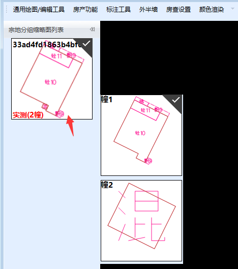 先选择层属构筑物所依附的自然幢,然后执行【房屋测量】功能,如果选择了多个自然幢,可在【房屋测量】界面的左侧进行切换;