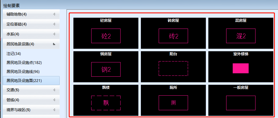 房屋要素只支持下图红框内的要素类(厕所、一般房屋除外):