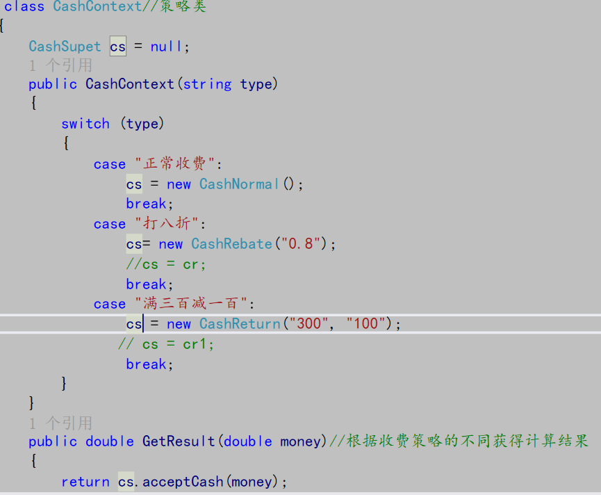 CashContext市一个策略类,用来接受客户端的条件返回对应的算法类,在最后调用算法